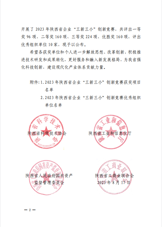 “三新三小”主要指企業(yè)經(jīng)營活動(dòng)中的“新技術(shù)、新工藝、新材料”和“小發(fā)明、小創(chuàng)新、小改造”?!叭氯 眲?chuàng)新競賽由陜西省科學(xué)技術(shù)協(xié)會(huì)、陜西省工業(yè)和信息化廳、陜西省人民政府國有資產(chǎn)監(jiān)督管理委員會(huì)、陜西省工商業(yè)聯(lián)合會(huì)共同主辦,是圍繞產(chǎn)業(yè)鏈部署創(chuàng)新鏈、圍繞創(chuàng)新鏈布局產(chǎn)業(yè)鏈,引導(dǎo)企業(yè)弘揚(yáng)創(chuàng)新文化、營造創(chuàng)新氛圍、傳播創(chuàng)新方法、激發(fā)創(chuàng)新熱情的省級創(chuàng)新競賽活動(dòng),且競賽項(xiàng)目必須是已經(jīng)在企業(yè)中實(shí)現(xiàn)全落地、有效運(yùn)行一年以上、取得一定社會(huì)經(jīng)濟(jì)效益的創(chuàng)新成果。